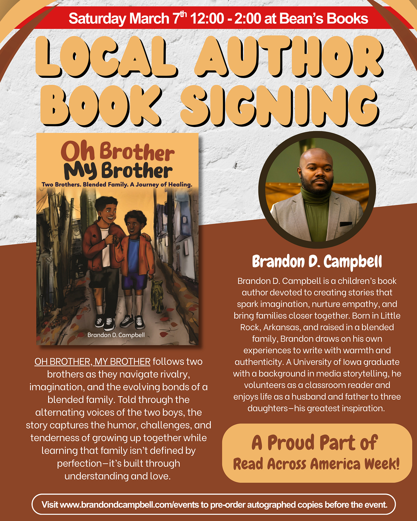 To celebrate, I’m excited to share that I’ll be doing an official in-store visit at Bean’s Books, located at 315 US-65, Conway, AR, United States, 72032. If you’re in the area, stop by between 12 and 2 PM to say hello and grab a signed copy of my debut children’s book, Oh Brother, My Brother. I’d love to meet you. ✍🏾📖